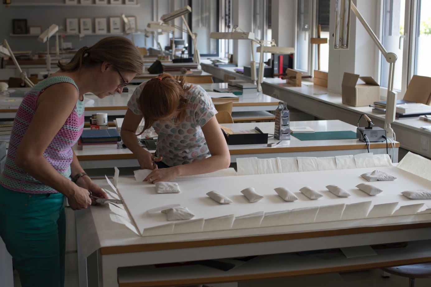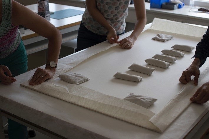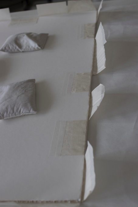 Die Fälzel wurden im Arbeitsablauf alternierend auf der Rückseite der Wabe mit Nassklebeband befestigt.