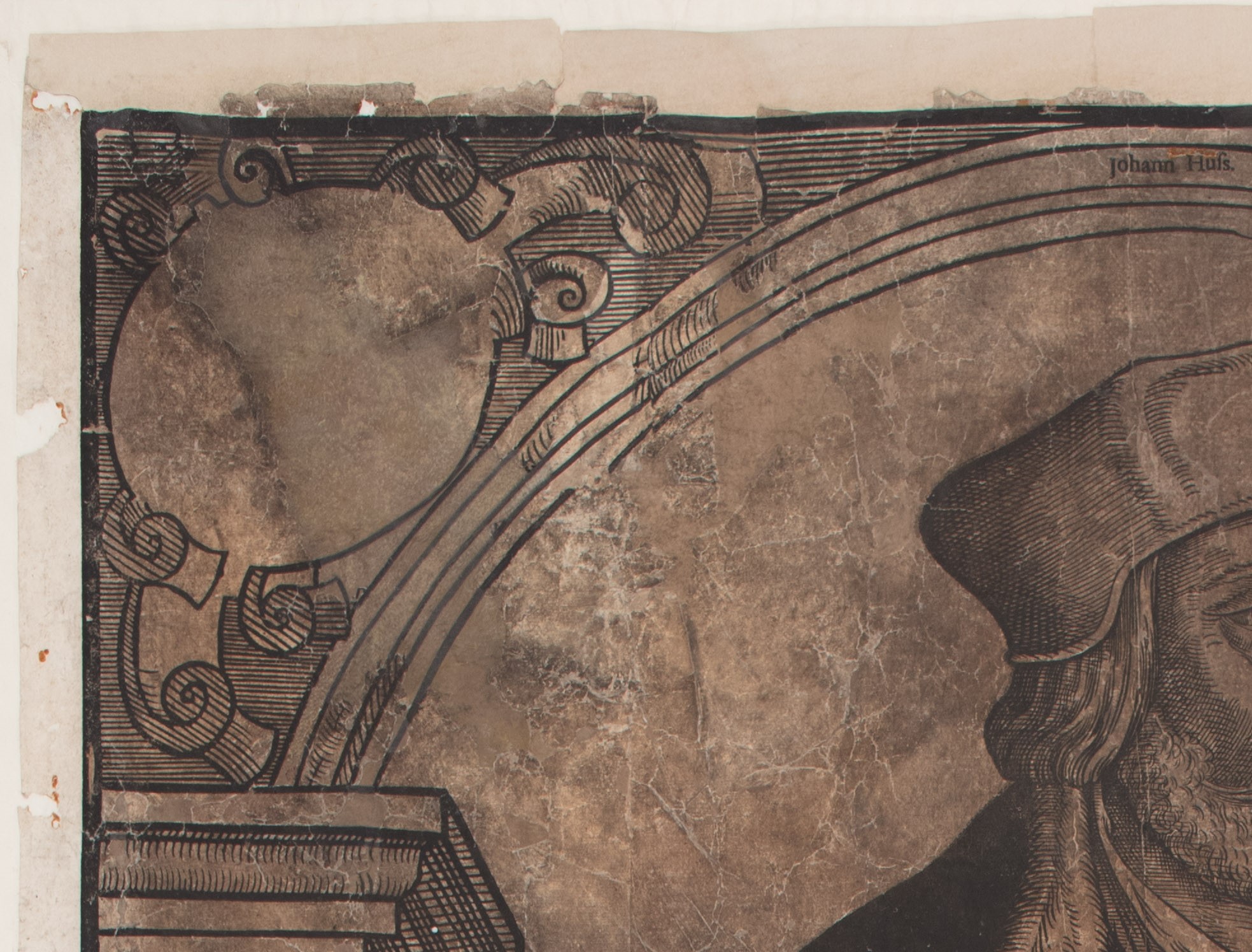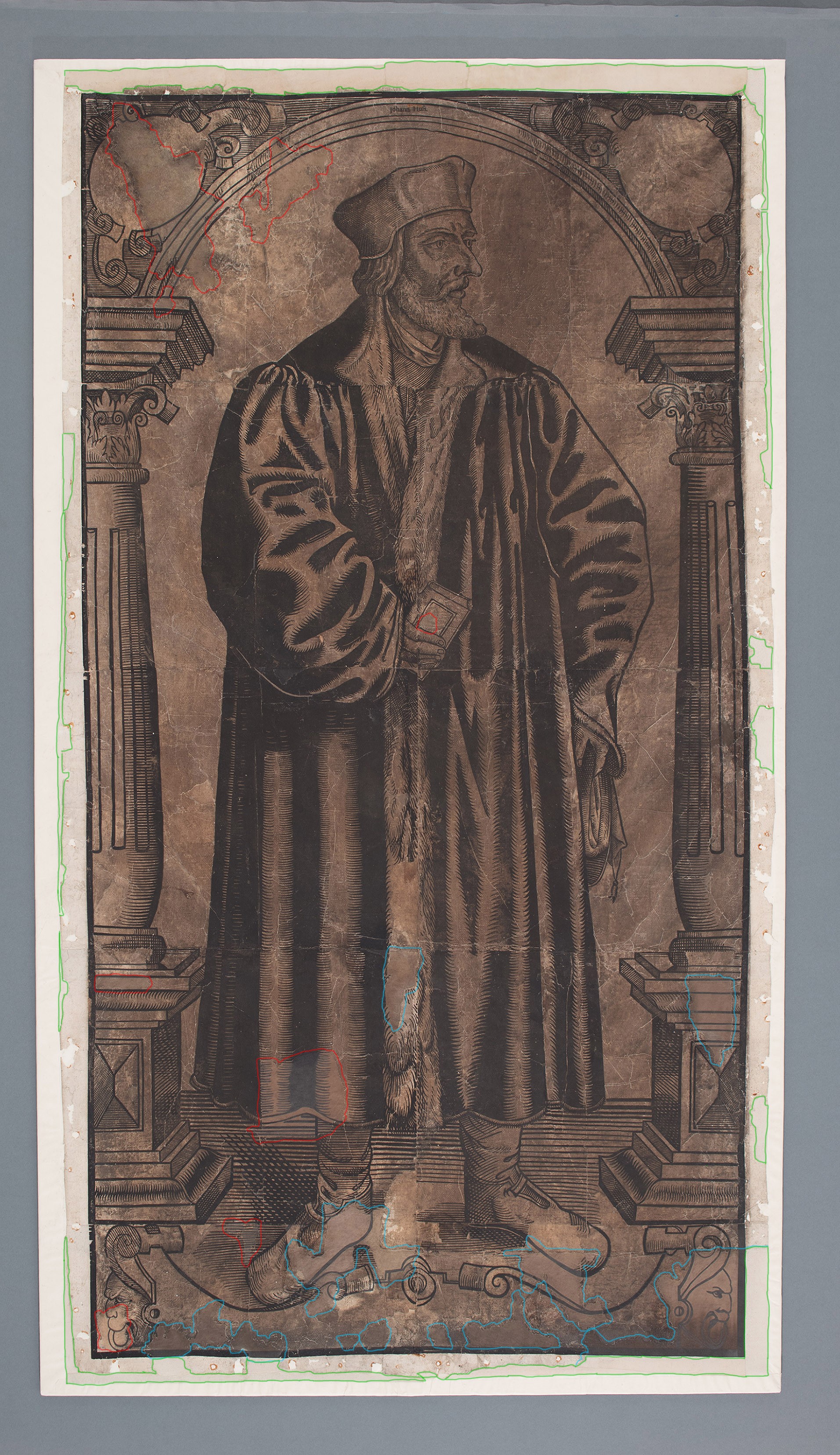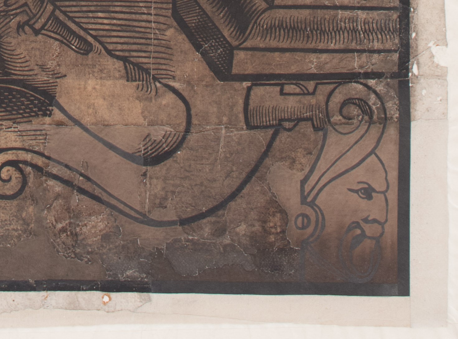 Die im oberen, weniger geschädigten Teil des Bildes liegenden Ergänzungen wurden optisch stärker integriert (Detail oben links aus der Gesamtaufnahme)