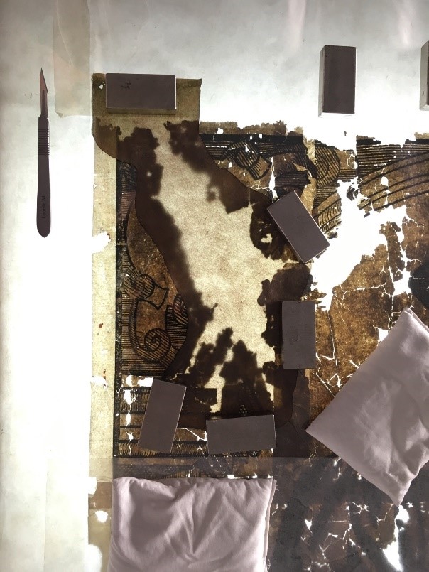 Der Umriss einer großen, zu ergänzenden Fehlstelle wurde auf dem Leuchttisch abgenommen. Dazu lag das schon eingefärbte Japanpapier auf einer transparenten Folie über der Fehlstelle positioniert.