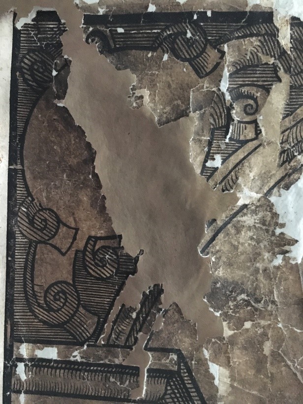 Nachdem die großen Fehlstellen des gealterten, stark bräunlichen Originalpapiers eingefügt waren, wurden die optisch besonders störenden Fehlstellen in den gedruckten Bildinien mit einem schwarz eingefärbten Japanpapier ergänzt (hier die Umfassungslinie des Drucks).