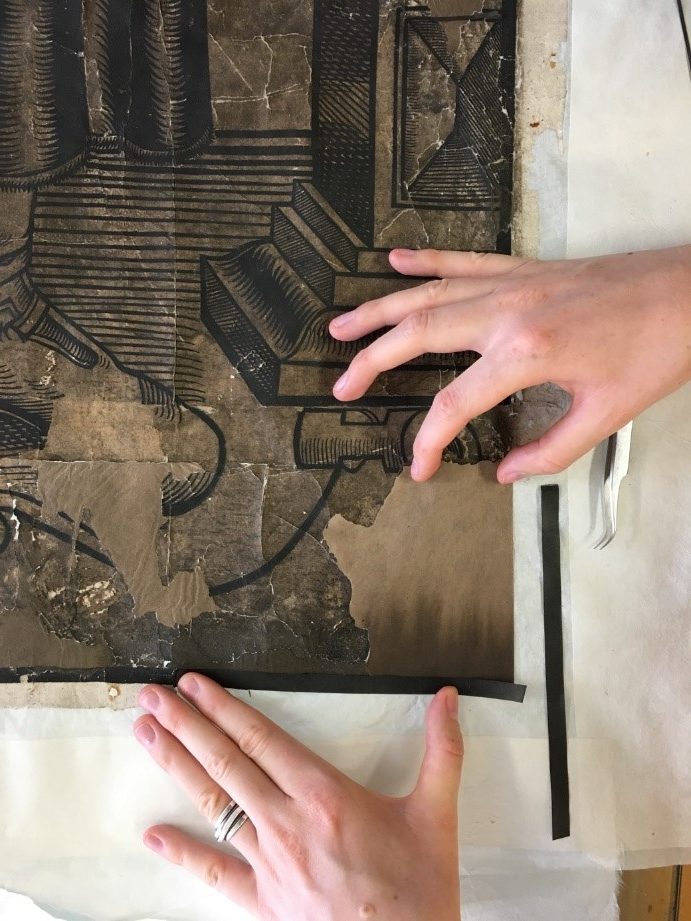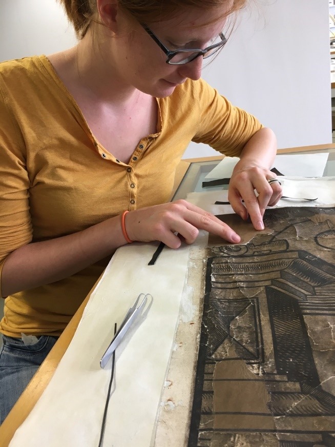 Leonie Müller beim Einpassen einer Ergänzung aus eingefärbtem Japanpapier in eine Fehlstelle im Holzschnitt.