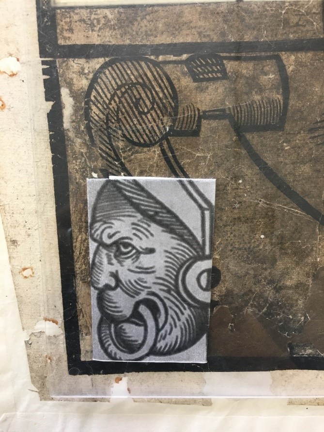 Nach der Montierung konnten abschließende Arbeiten am Holzschnitt „Jan Hus“ durchgeführt werden. Aufgrund der vielen Fehlstellen war der Druck noch nicht optimal lesbar, weshalb es nun galt, sein Erscheinungsbild durch entsprechende Ergänzungen zu verbessern. Dazu wurde ein farblich passend eingefärbtes Japanpapier passgenau ausgeschnitten, in die Fehlstelle eingeklebt und beschwert getrocknet. Bei den großen Fehlstellen wurde ein flächig eingefärbte Japanpapier anschließend lokal retuschiert, um Farbverläufe innerhalb einer Fehlstelle an den Übergängen zum Original farblich anzupassen
