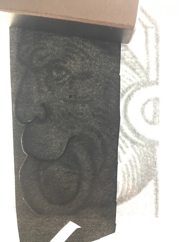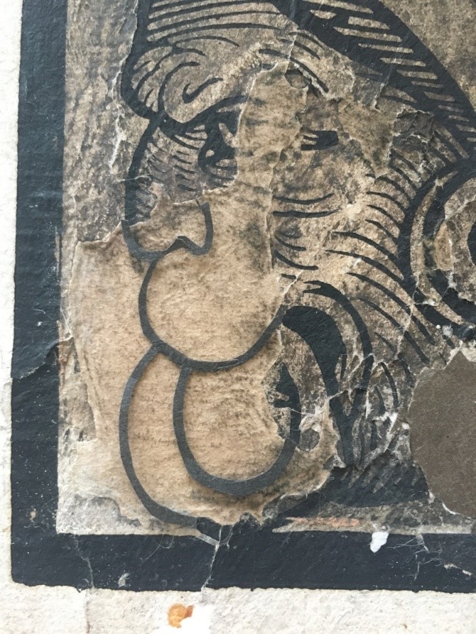 Der zu ergänzende Umriss der dargestellten Figur wurde in Scherenschnittmanier aus dem eingefärbten Japanpapier ausgeschnitten. Hier liegt diese Ergänzung des gedruckten Bildes zur Überprüfung auf der schon eingeklebten Ergänzung des Papiers.