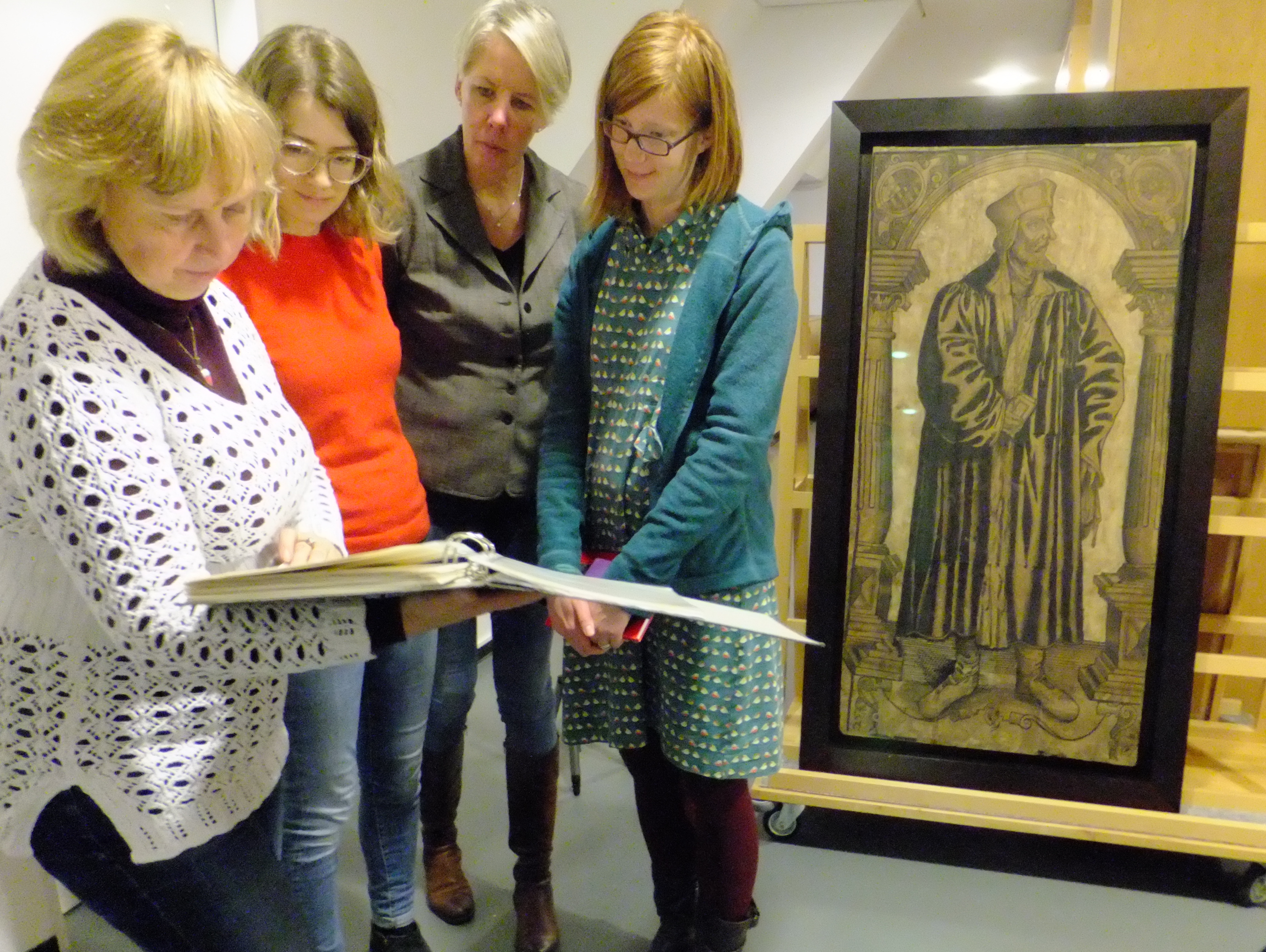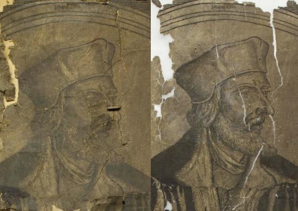 Nach seiner Montierung kann Cranachs Holzschnitt „Jan Hus“ zum ersten Mal vertikal stehend auf seine Wirkung nach Ergänzung der Fehlstellen und hinsichtlich der Retusche betrachtet werden.