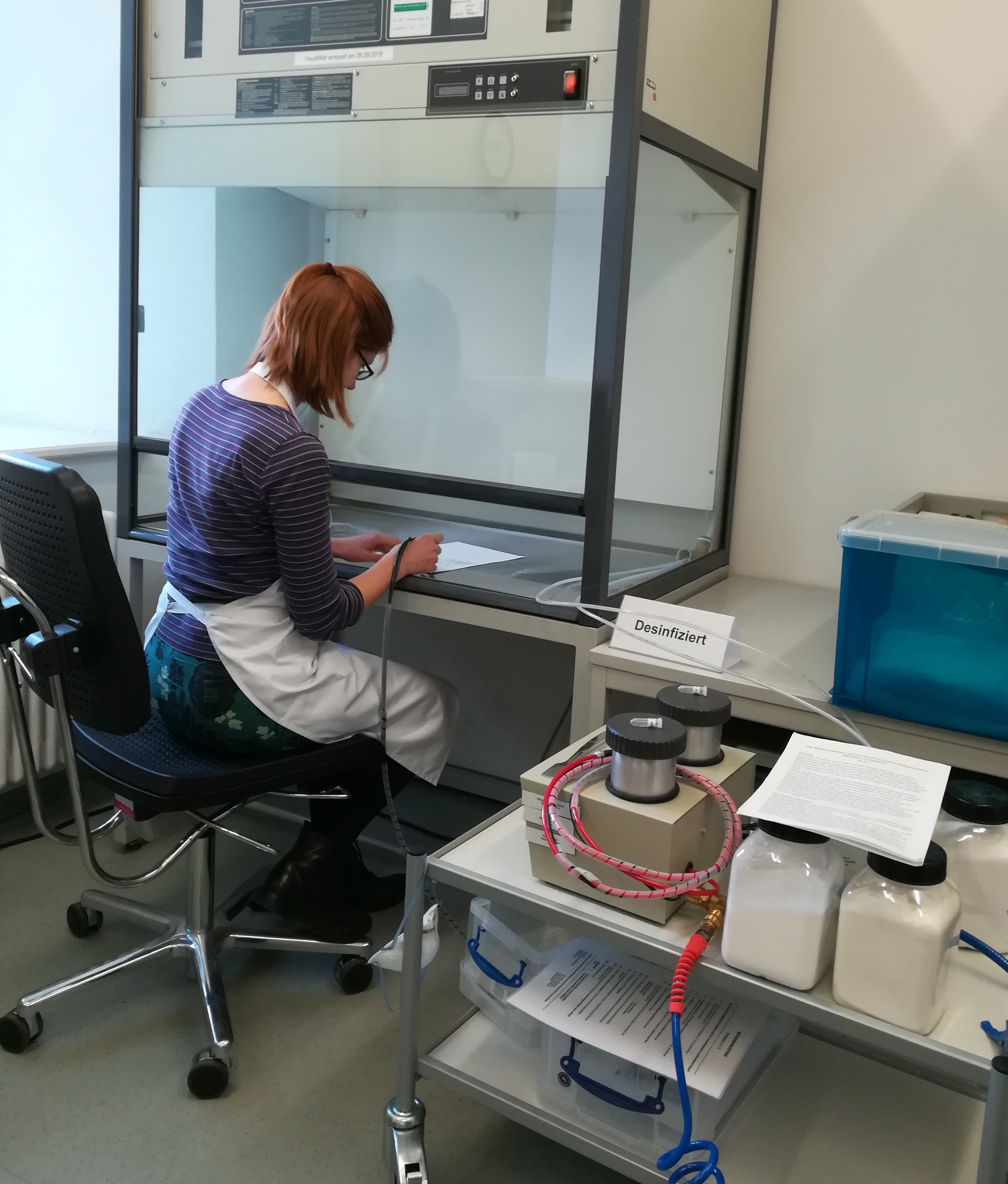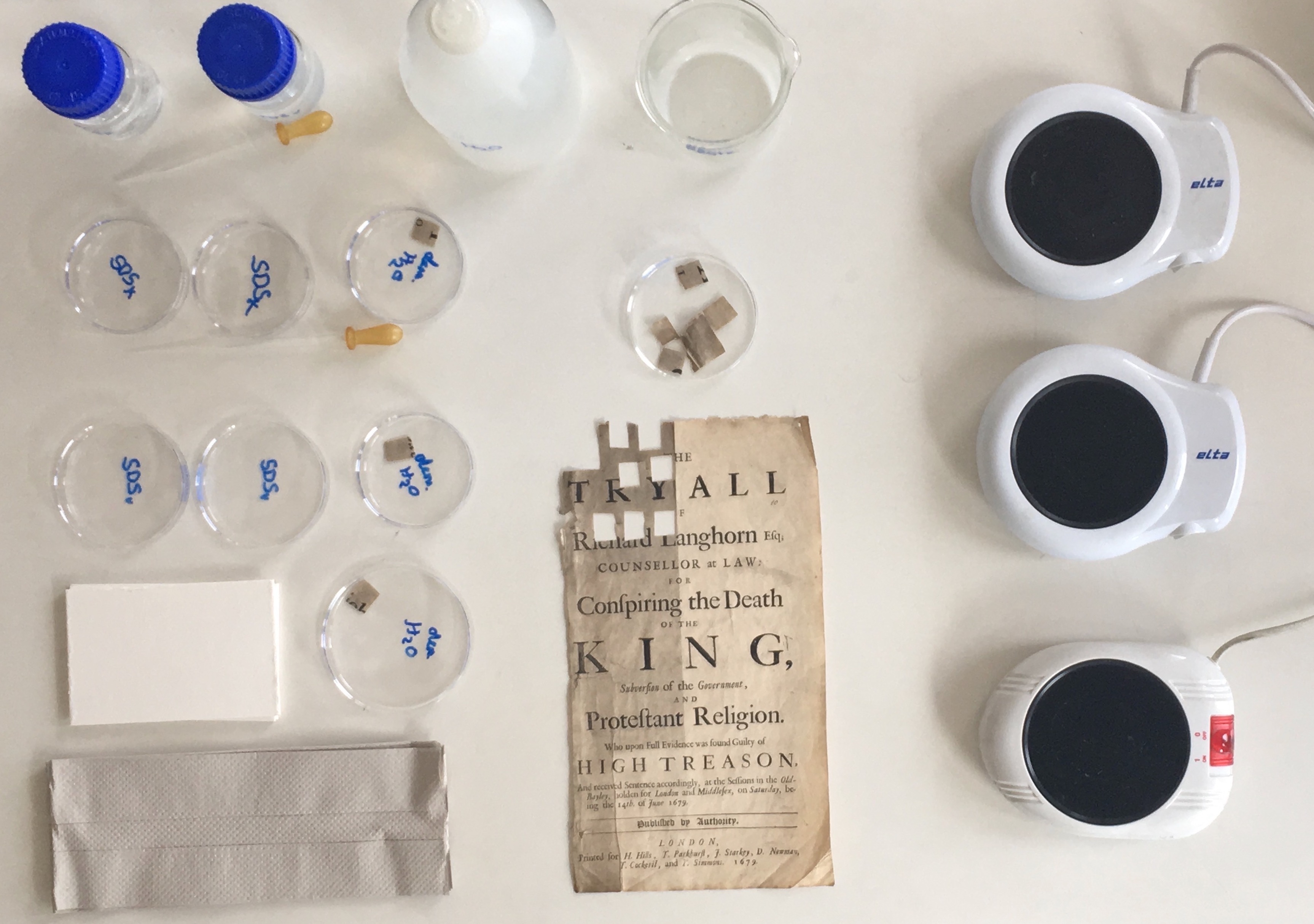 Beim Weichstrahlen zur Reinigung von Oberflächen wird mit Arbocel (Cellulosefasern) oder Weizenstärkepartikeln gearbeitet, die durch Luftdruck durch eine Düse auf die Objektoberfläche treffen. Das Institut für Erhaltung am Landesarchiv Baden-Württemberg in Ludwigsburg stellte uns ein solches Gerät für eine Testreihe an Probenpapieren und ausgewählten Originalfragmenten zur Verfügung.