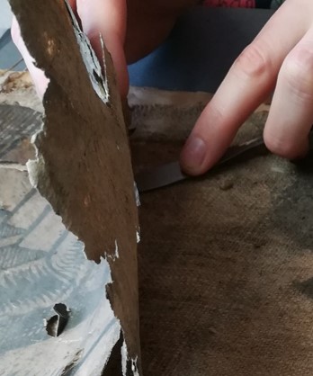 Da die Leinwand nicht zusammen mit dem Druck wässrig behandelt werden kann, muss diese vorher abgenommen werden. Wie schon bei der mit einem Karton hinterklebten Ecke zeigte sich, dass sich die Leinwand mit Unterstützung eines Spatels Stück für Stück von der Rückseite der Graphik trennen ließ.