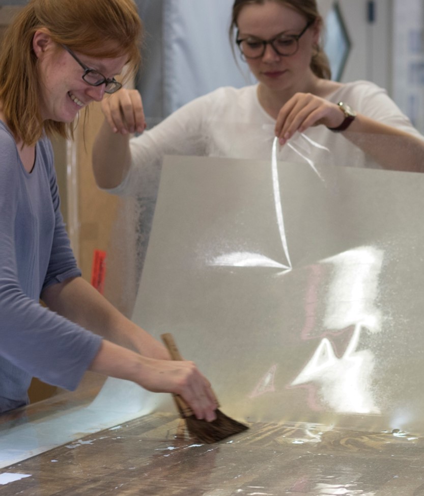 Um den fragmentierten Druck zu stabilisieren, wurden die einzelnen Fragmente über feine, mit BEVA® beschichtete Japanpapierbrücken gesichert.