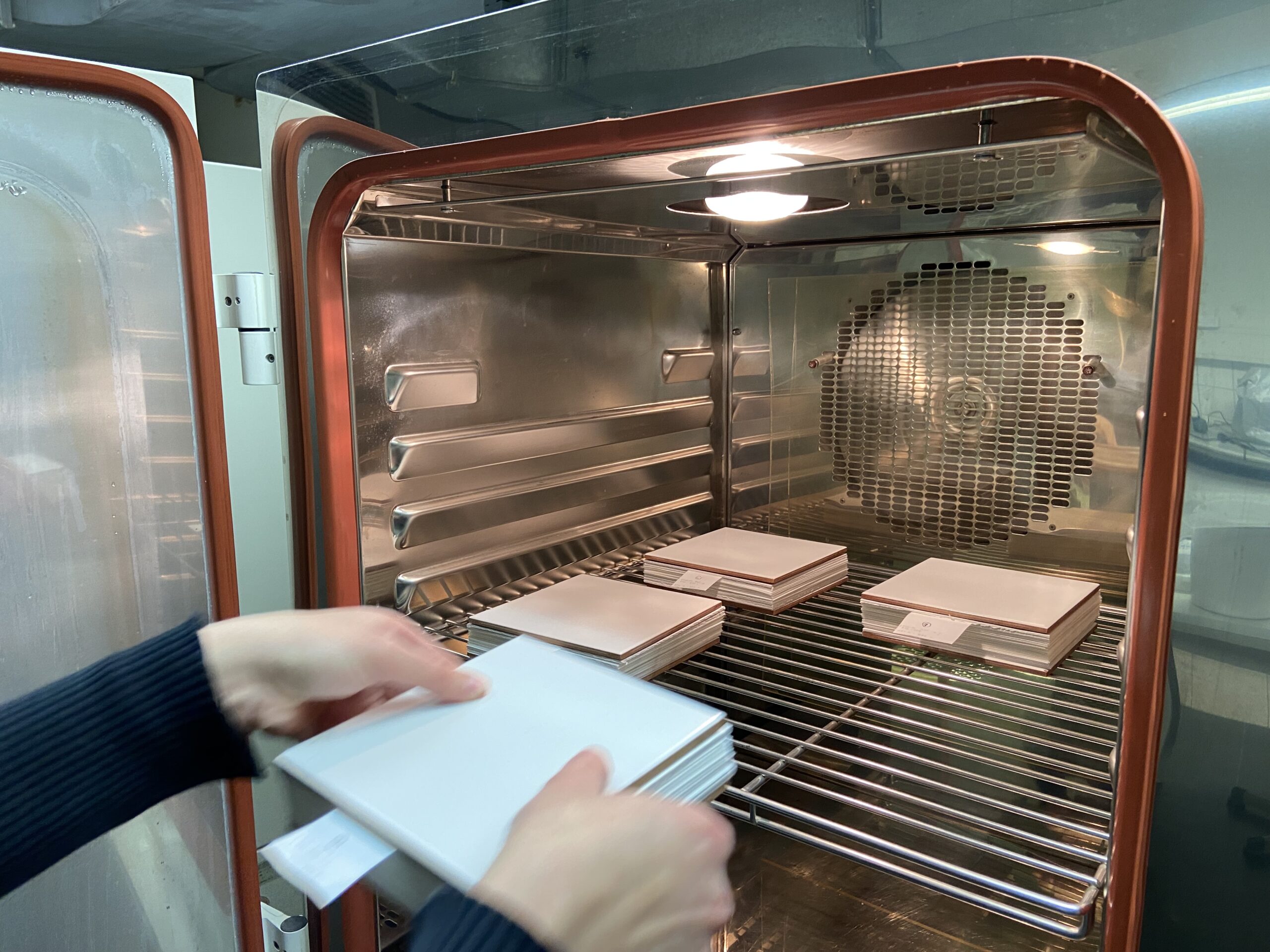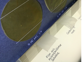 June 2022: The team in Stuttgart evaluates the sample set after a first accelerated aging step. After one week of moist-heat aging the differences between aged samples (in the picture, they can be distinguished because they are resting on white papers) and non-aged references are still small, as desired at this stage.