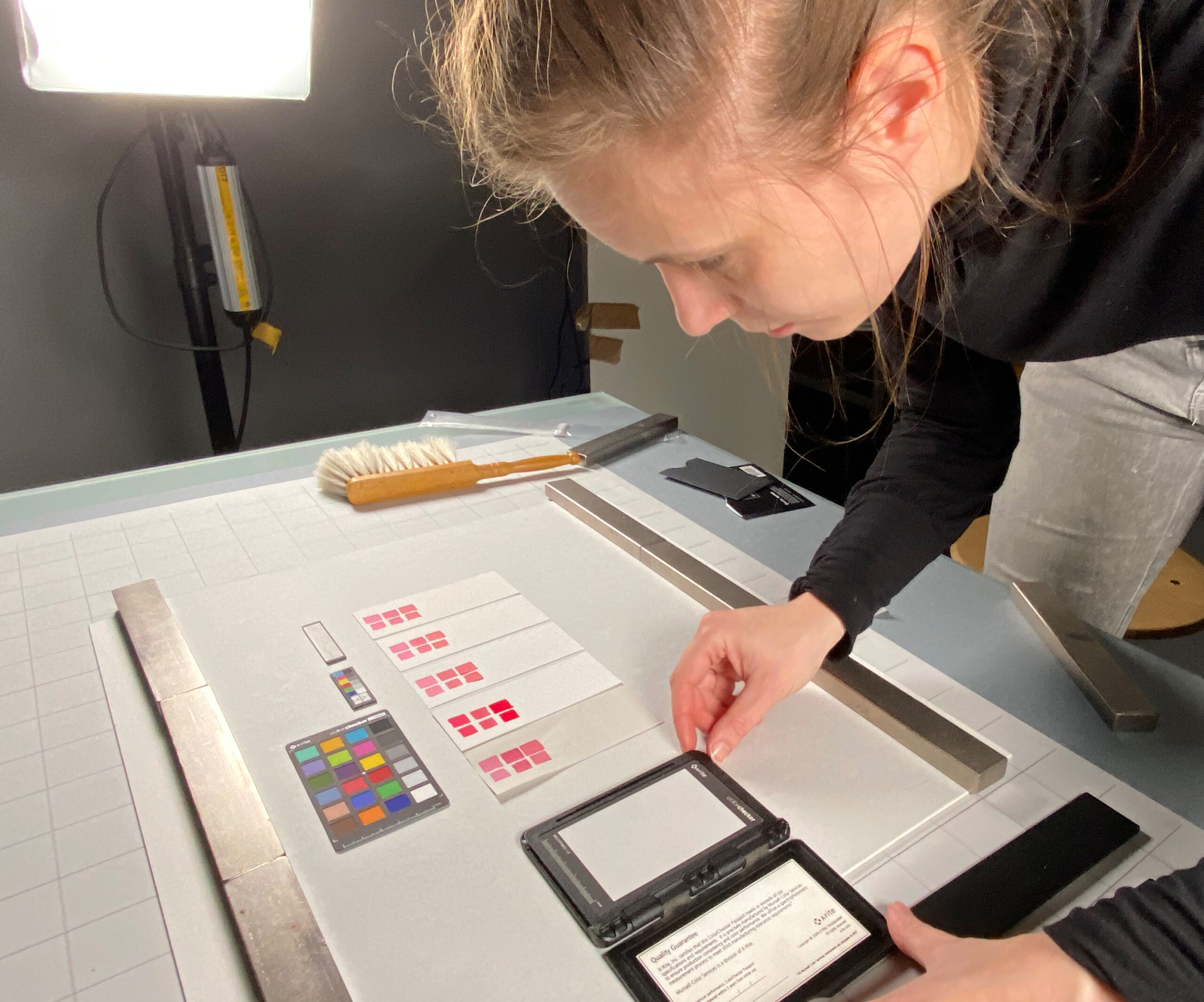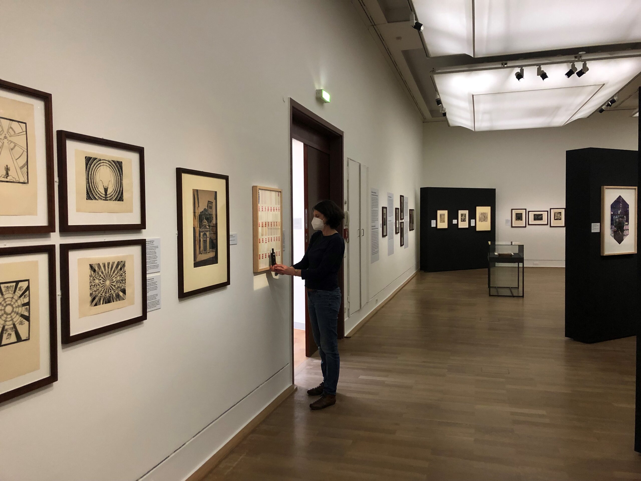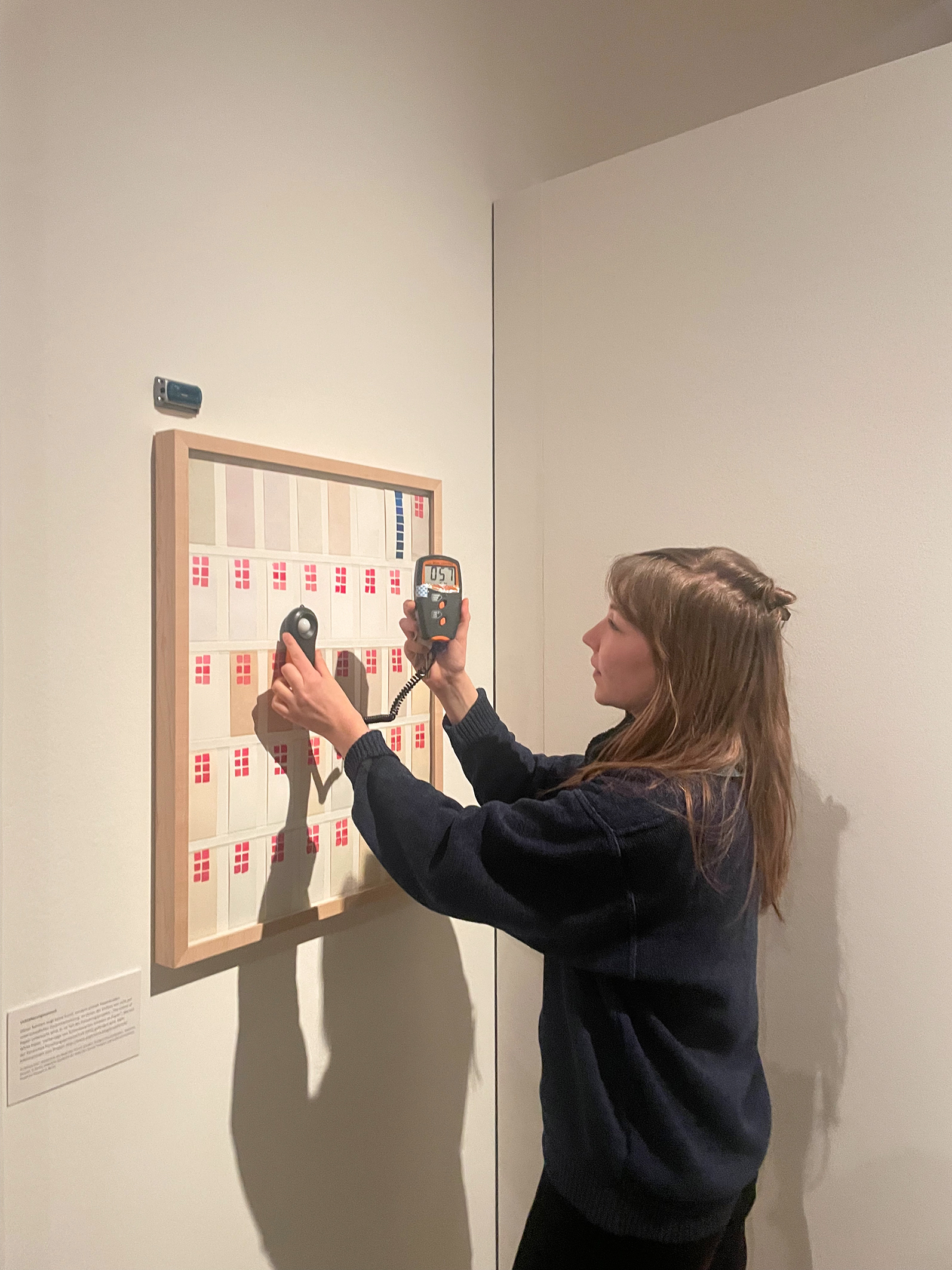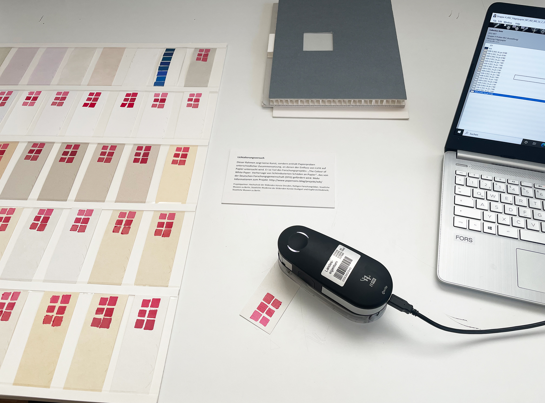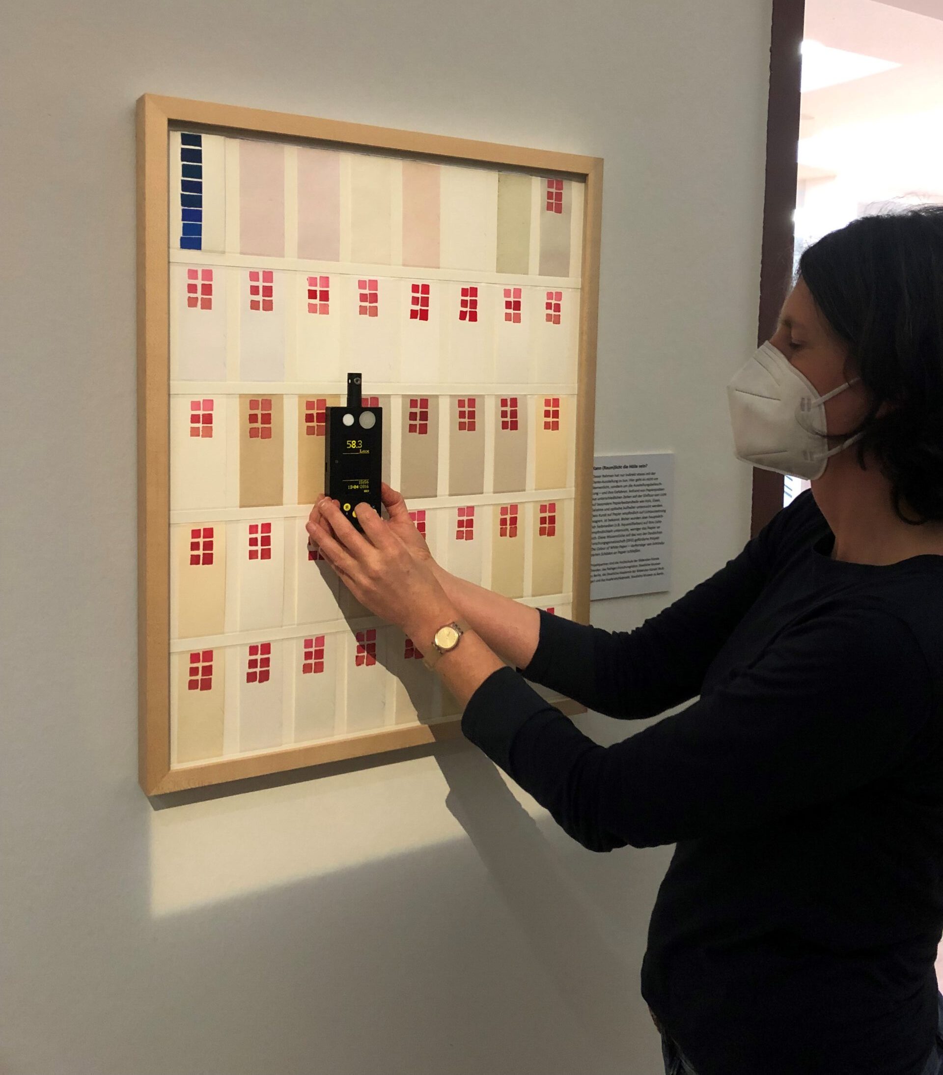 Febrruary–March 2023: At the Kupferstichkabintt, the sets of exhibited samples were unframed and colorimetrically measured. Stuttgart paper conservation student Janine Nedela was in charge of these measurements, supported by the Kupferstichkabinett conservation department staff.