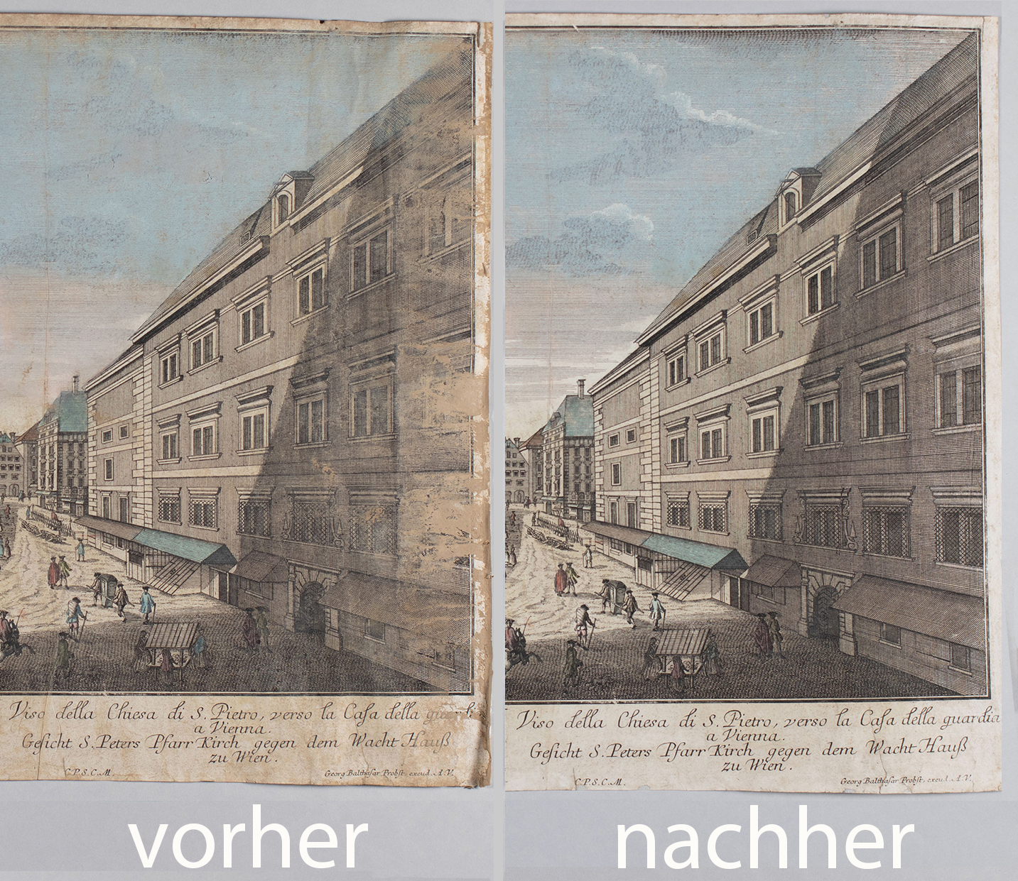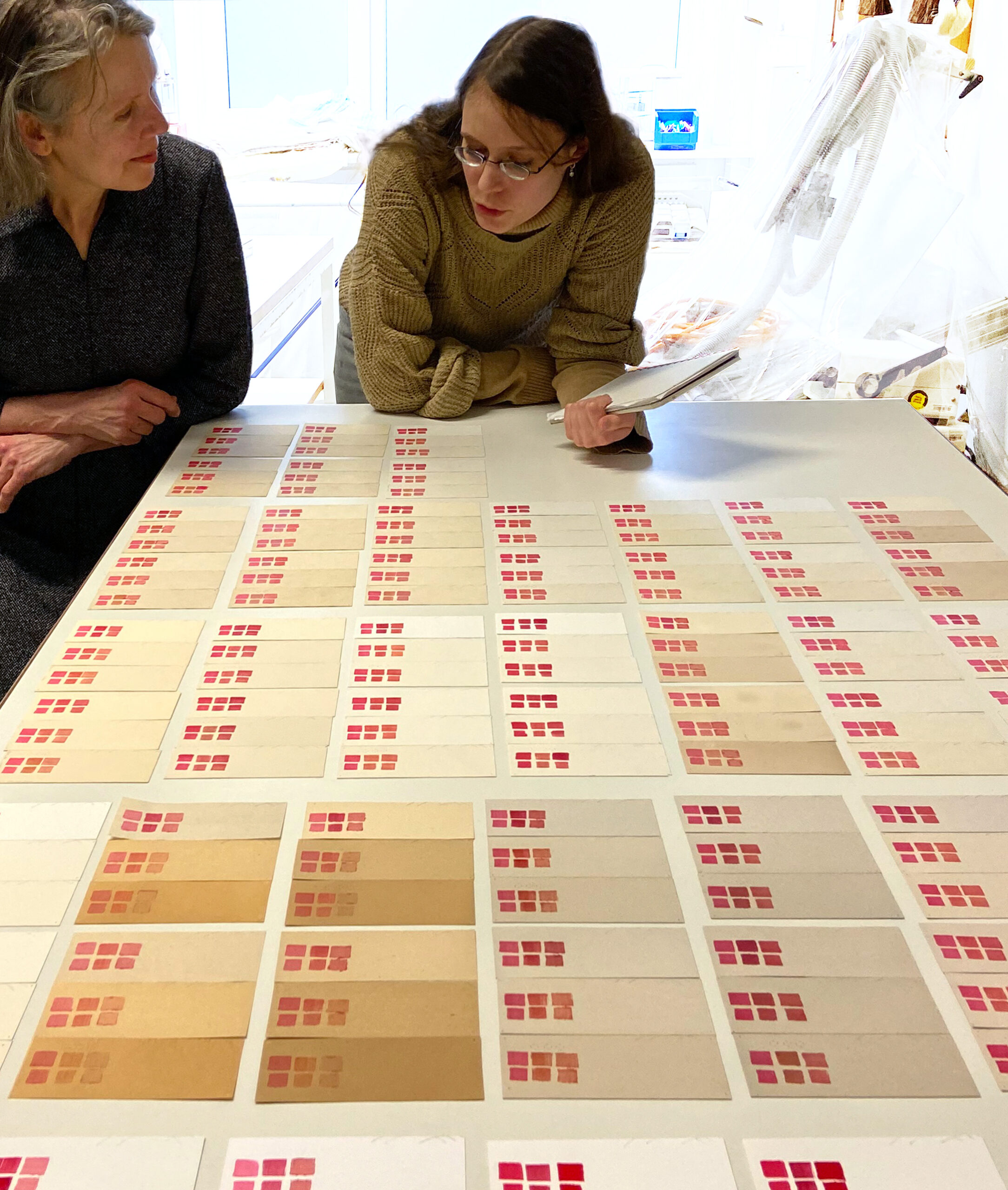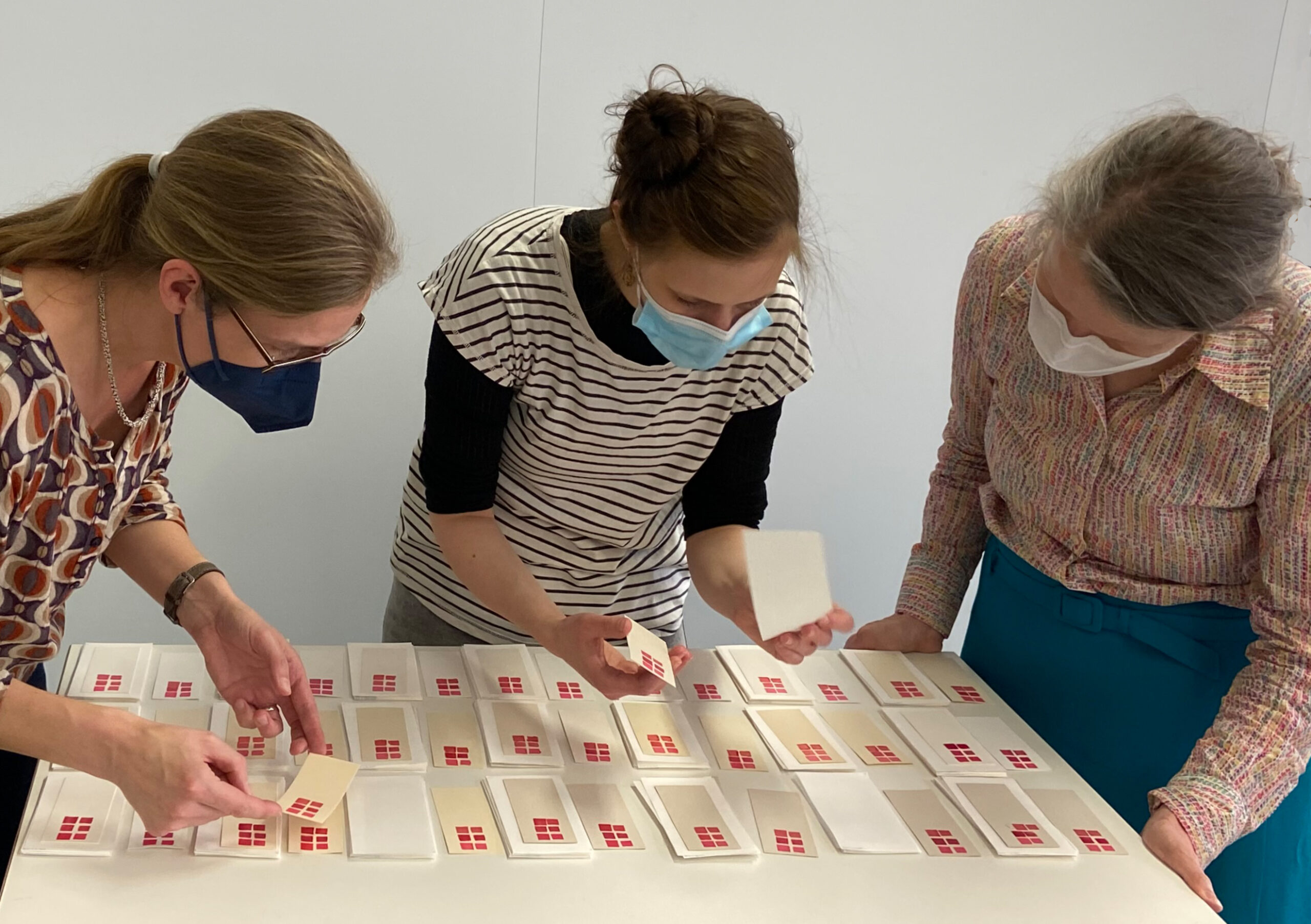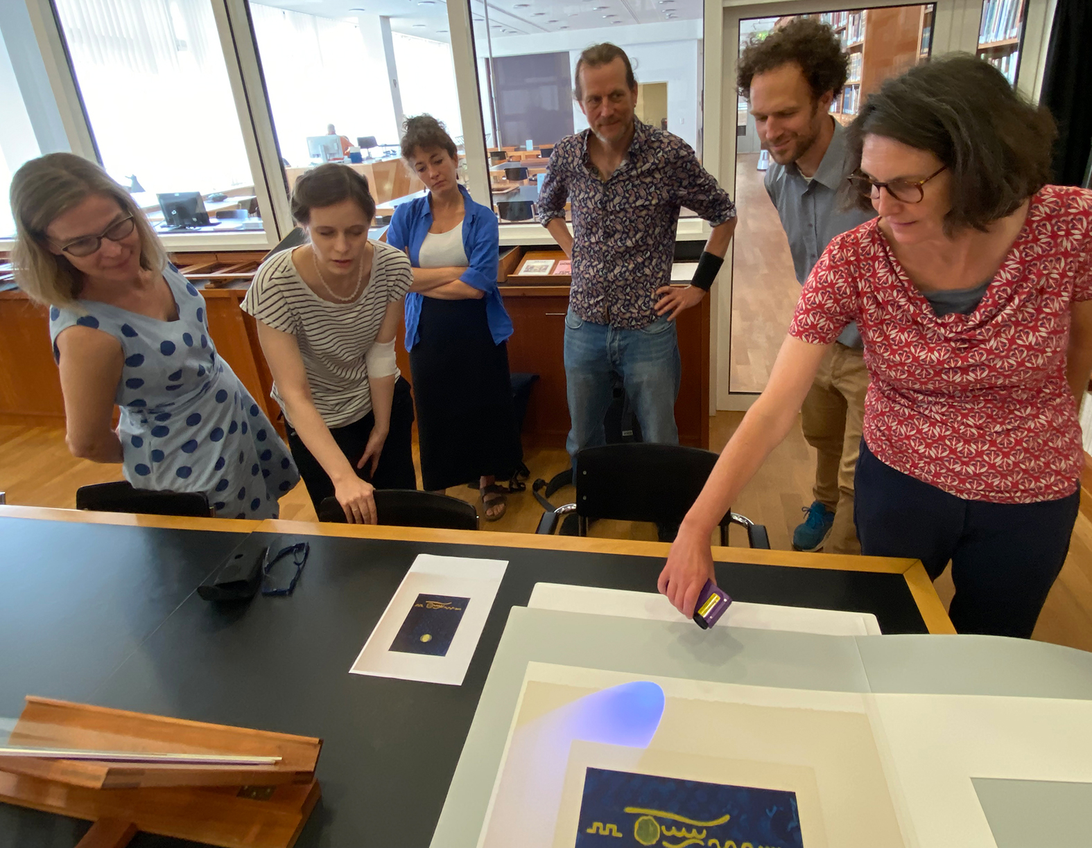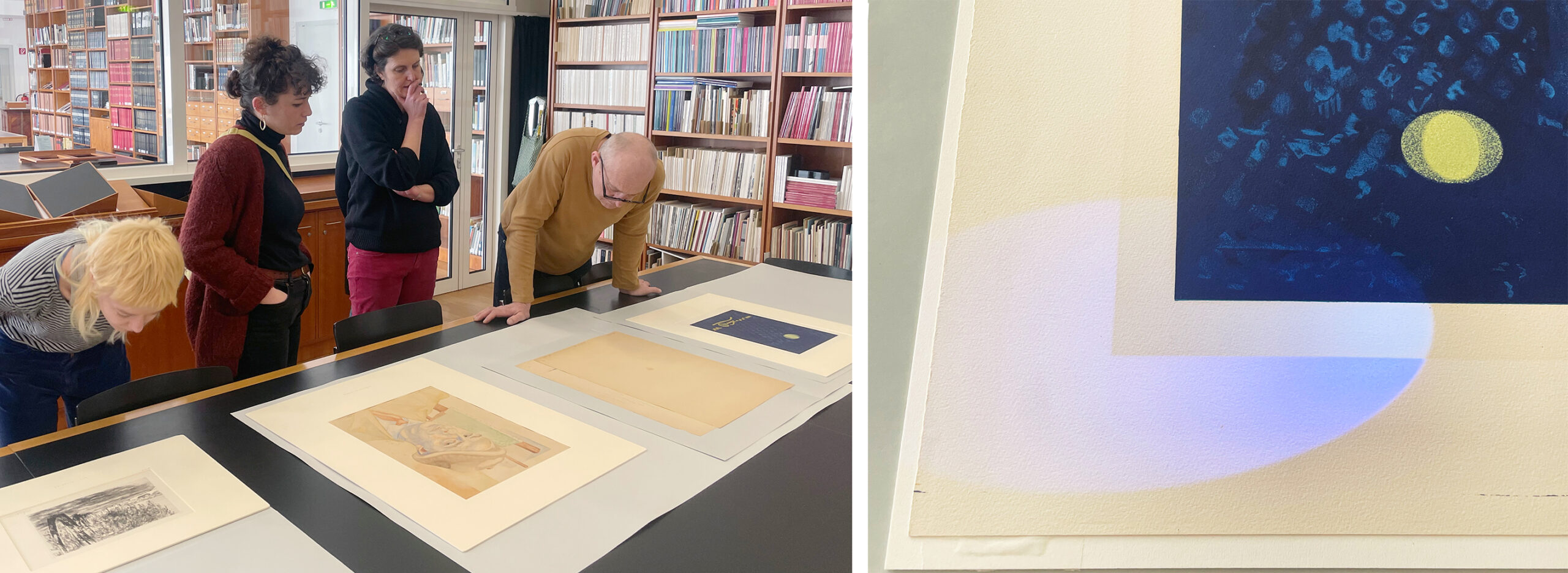 Febrruary–March 2023: At the Kupferstichkabintt, the sets of exhibited samples were unframed and colorimetrically measured. Stuttgart paper conservation student Janine Nedela was in charge of these measurements, supported by the Kupferstichkabinett conservation department staff.
