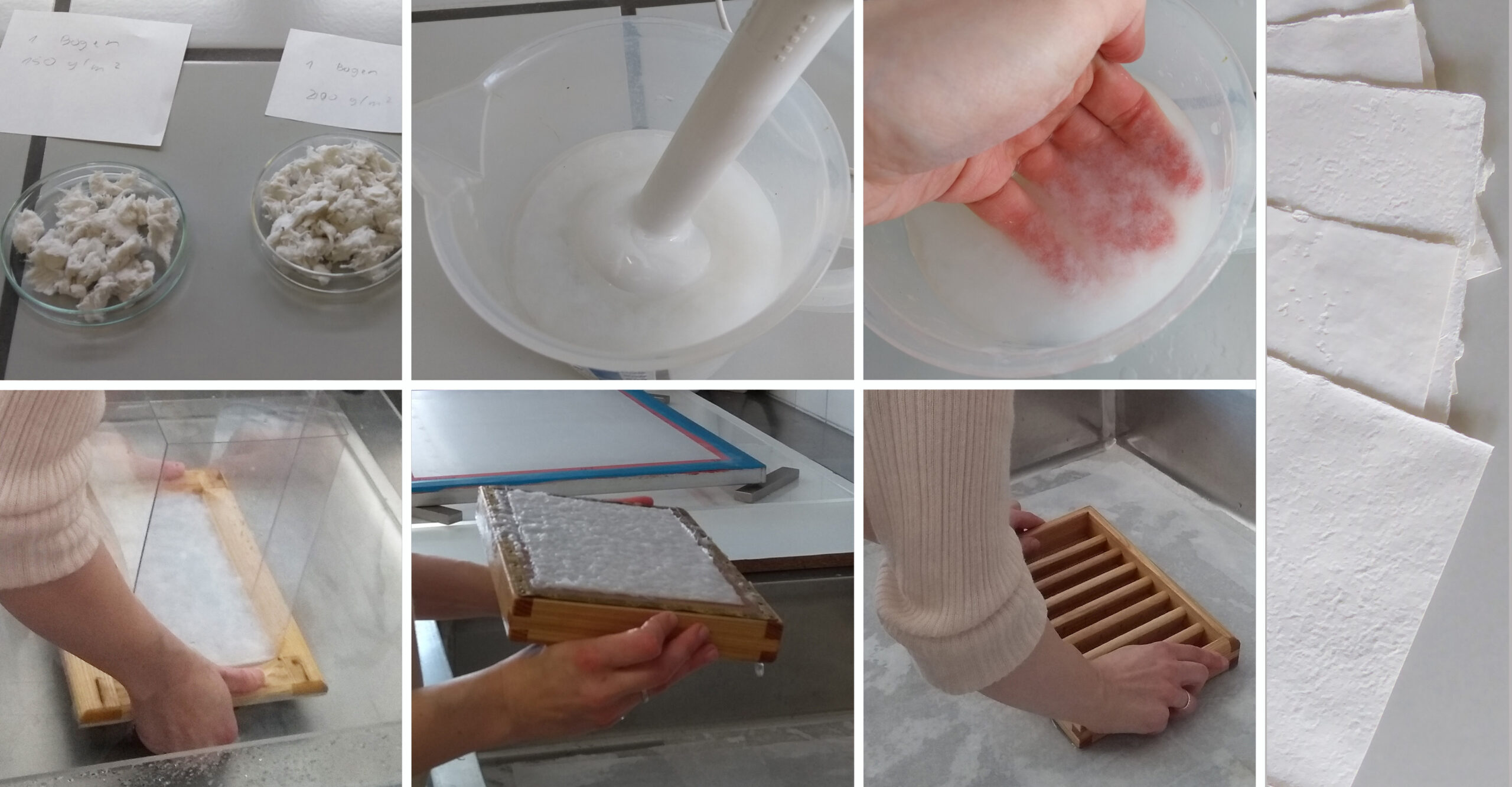 Top row: moist pulp weighted, dispersing a pulp sample, checking the pulp dispersion; bottom row: sheet formation, water drainage, couching; right: first set of paper samples