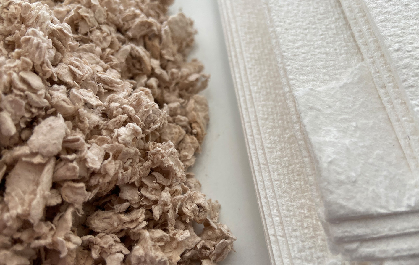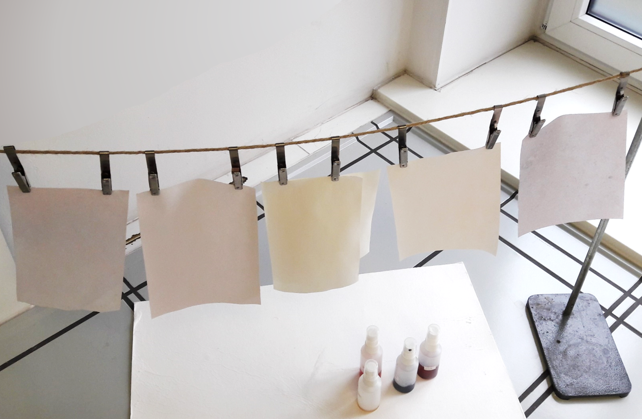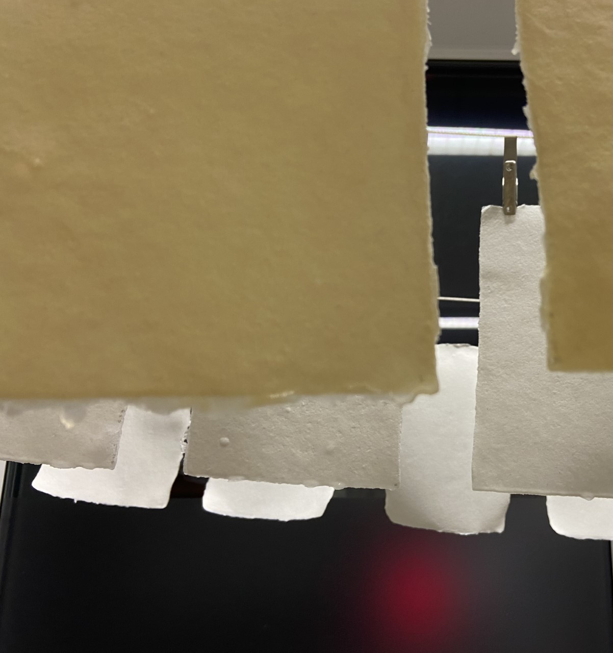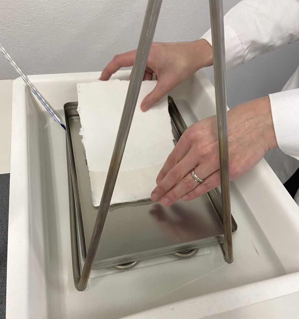 The procedures of sheet production have undergone testing after selected fabrics were prepared by Gangolf Ulbricht, Berlin, to achieve a pulp quality appropriate for our research.