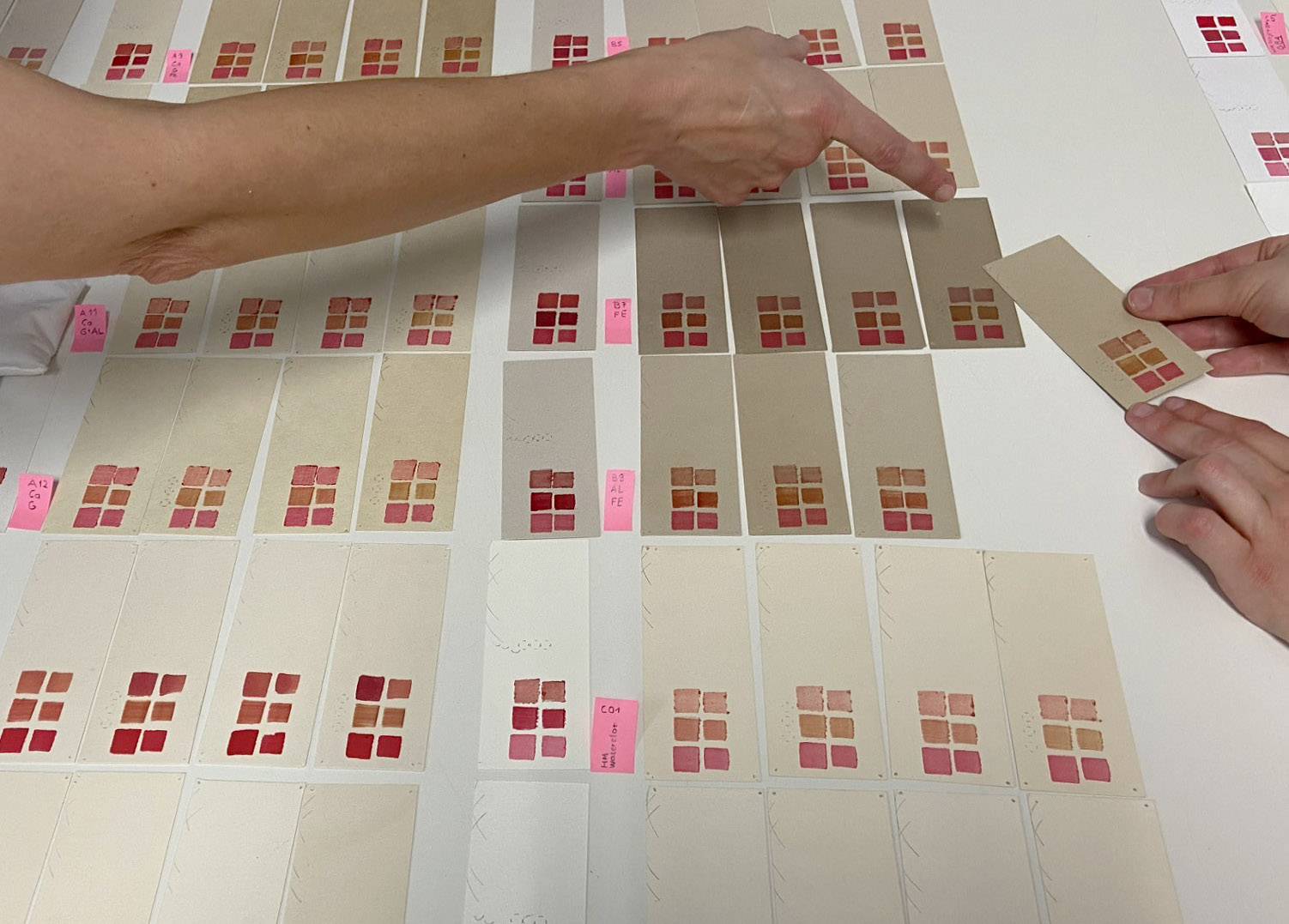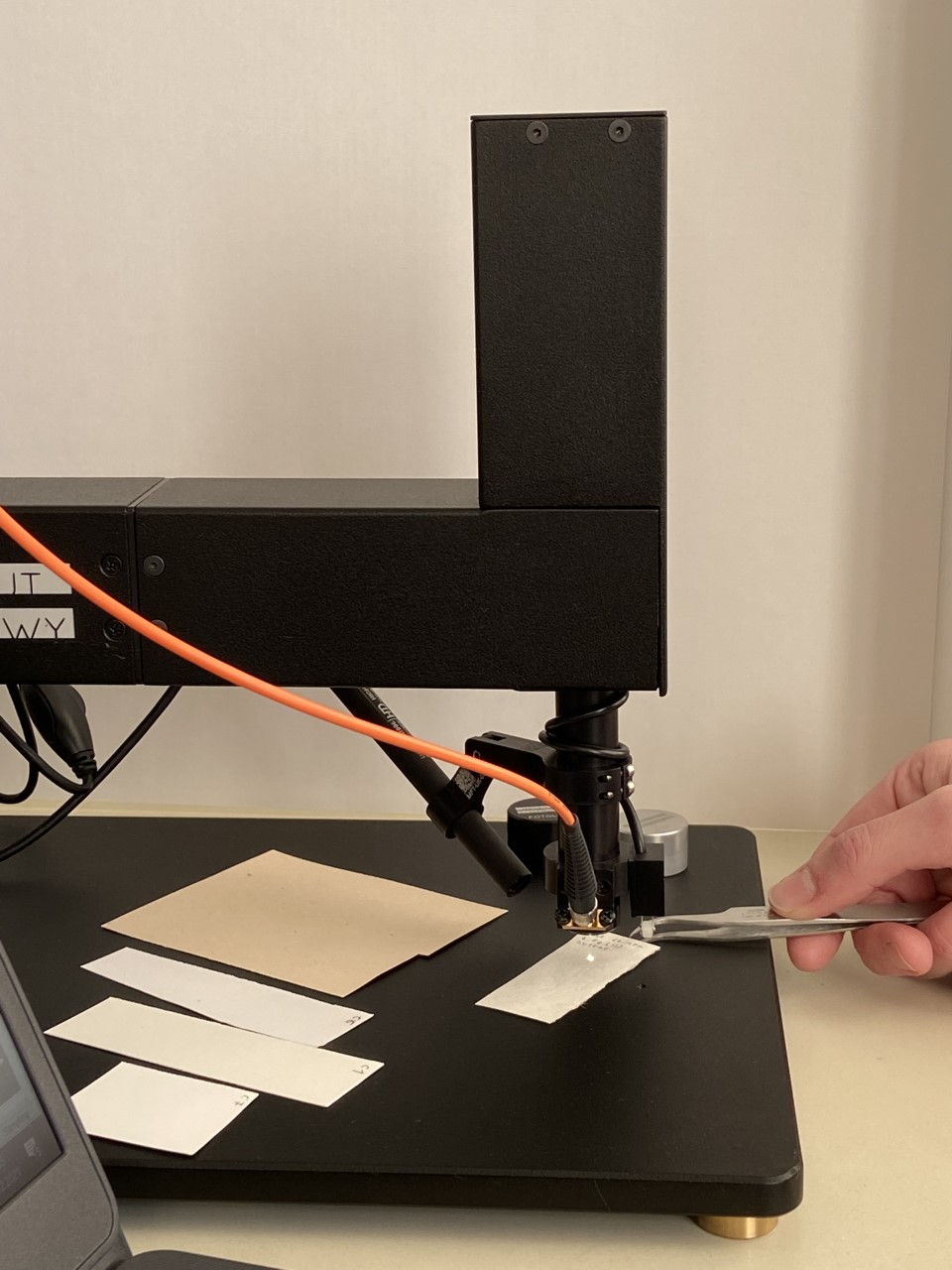 The sample sets undergo different testing regimes at our three partner institutions: At the Kupferstichkabinett in Berlin, three sets are exposed to museum and gallery-style lighting situations. Two sets undergo accelerated climate and light aging at the Stuttgart Academy. Color changes in the Berlin and Stuttgart sets are recorded colorimetrically. Stuttgart sets also undergo MFT using an instrument with LED source. The Rathgen-Forschungslabor in Berlin and the Technische Universität Dresden work with a Xenon-source MFT on sample sets.