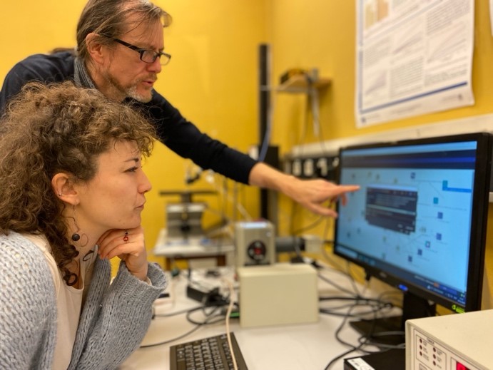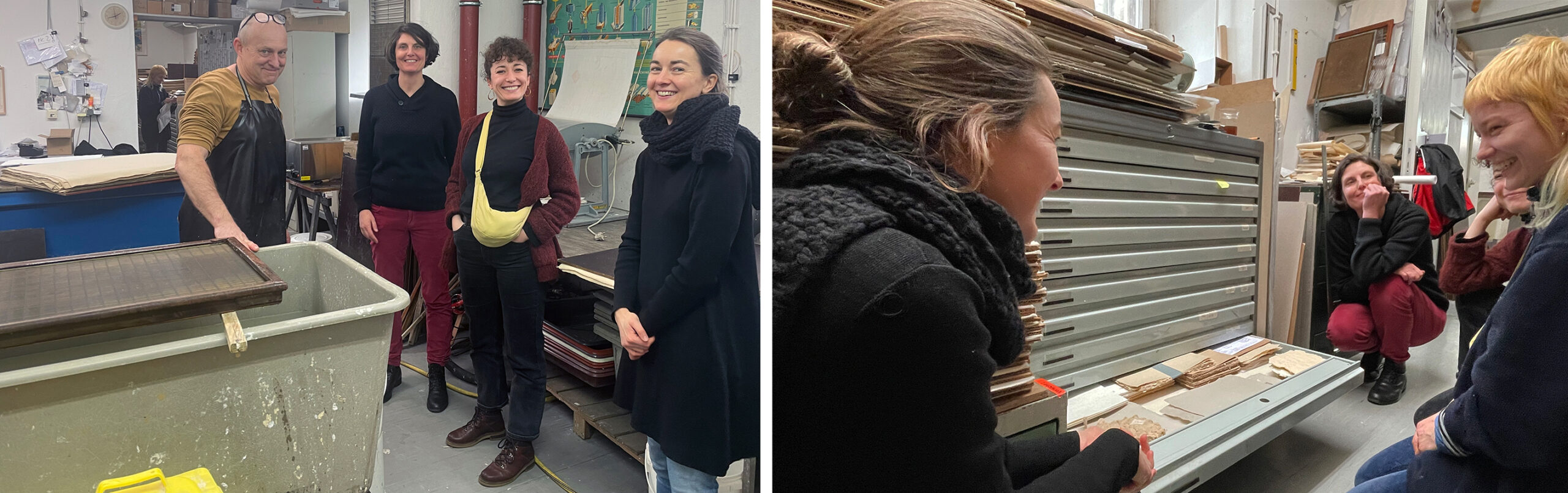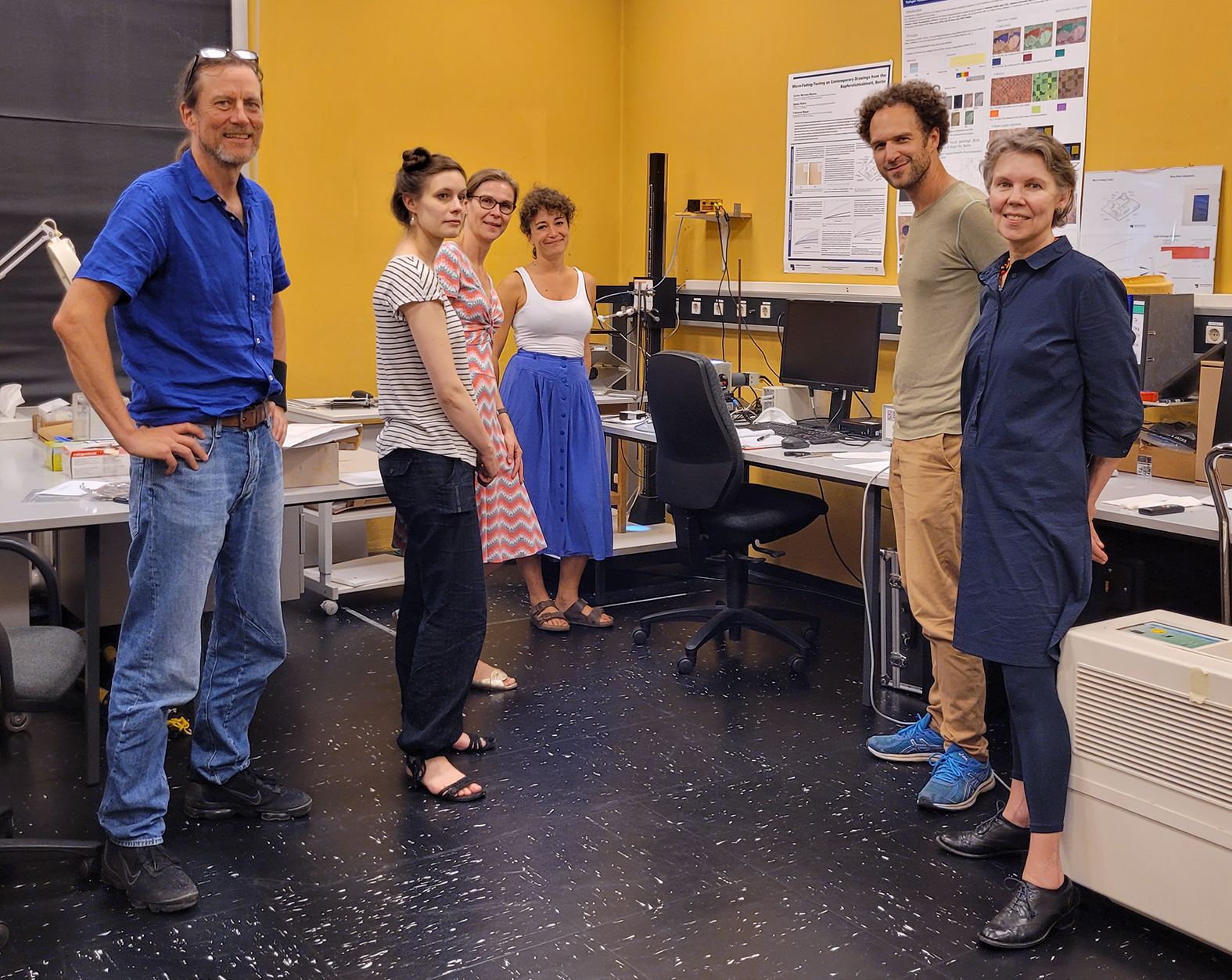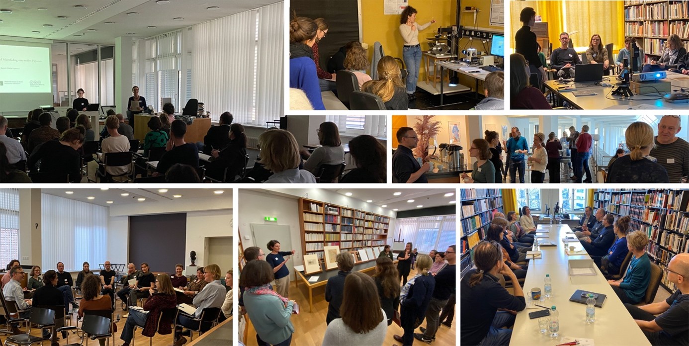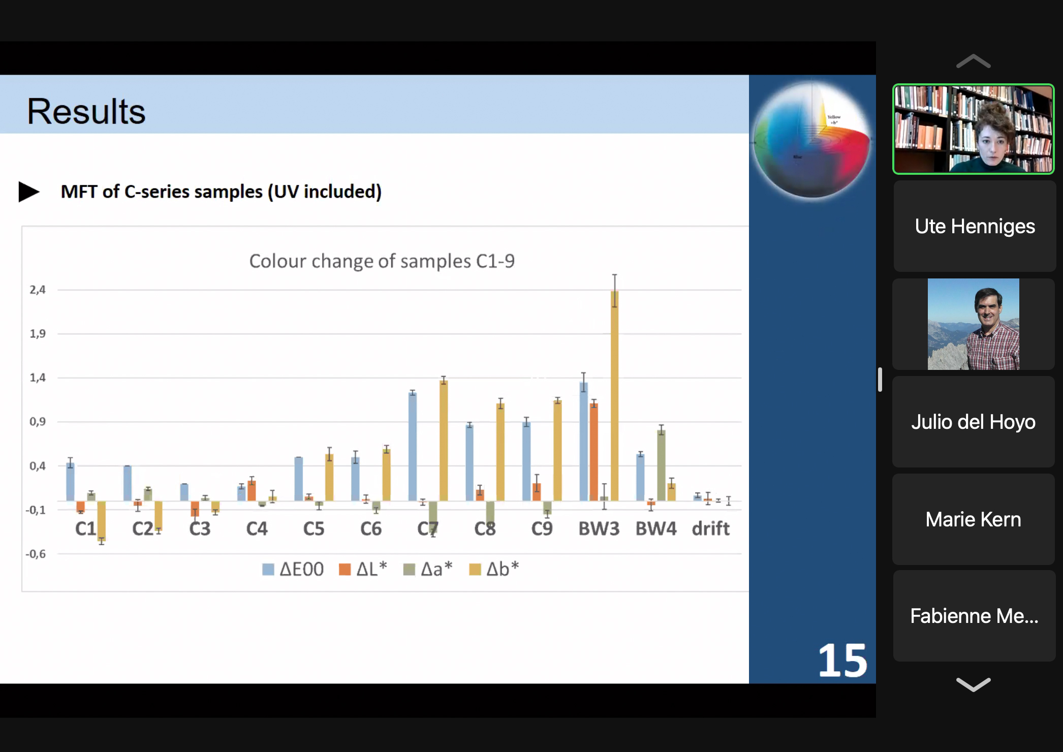 March 4–5, 2024: Impressions from the two-day workshop “Microfading Testing und Kunstwerke auf Papier”. The workshop was hosted at the Kupferstichkabinett Staatliche Museen zu Berlin, and the Rathgen Forschungslabor, both at the Stiftung Preußischer Kulturbesitz. We presented our research to a group of conservators responsible for preservation in large collections where light-budgeting is a constant preservation theme with works on paper. Top left to right: Talks presented at the Kupferstichkabinett, Staatliche Museen zu Berlin; Giulia Vannucci demonstrates the xenon-MFT instrument; Marie Kern demonstrates the LED-MFT instrument; center right: participants during coffee break; bottom row, discussion groups: on light budgeting policy (left), on color changes of artworks (center), and the potential of MFT use in collection preservation.